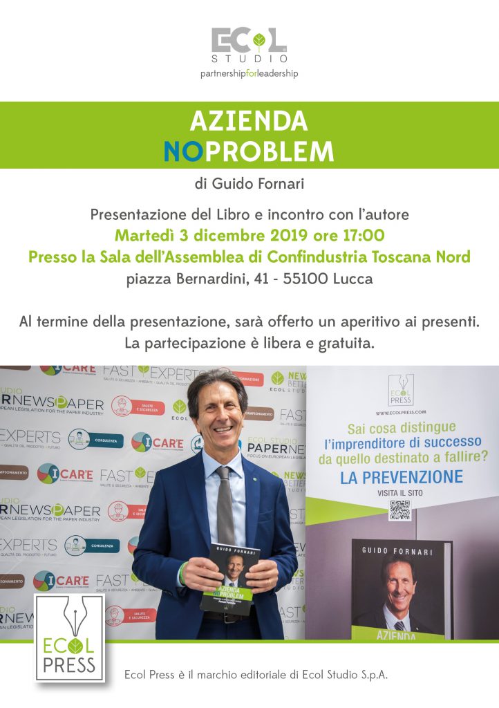 Lucca, martedì 3 dicembre 2019. Presso la Sala dell’Assemblea di Confindustria Toscana Nord in piazza Bernardini, si terrà la prima presentazione al pubblico del libro Azienda No Problem. Prevenire e vincere con il Metodo Fornari Formula (Ecol Press, 2019), scritto dall’imprenditore Guido Fornari fondatore di Ecol Studio S.p.A., nota società di analisi consulenza e formazione del territorio lucchese.